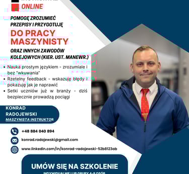 Mając świadomość odpowiedzialności jaka ciąży na barkach pracowników związanych z ruchem kolejowym, moim celem jest rzetelne i praktyczne wsparcie specjalistów przygotowujących się do pracy na kolei. Działalność prowadzona przeze mnie powstała z pasji do kolejnictwa, poczucia odpowiedzialności za bezpieczeństwo w kolejnictwie oraz wieloletniego doświadczenia w pracy maszynisty i instruktora. Zawodowo, przez ostatnie lata intensywnie szkoliłem oraz szkolę kadry na potrzeby przewoźników kolejowych. Przez moje ręce przewinęły się setki kandydatów na maszynistów, którzy już dziś z powodzeniem, czynnie prowadzą pociągi w ramach kategorii B1, B2 oraz innych. Szkolenia realizowane przeze mnie opierają się na realnej praktyce, aktualnych przepisach oraz rzeczywistych sytuacjach spotykanych w codziennej służbie. Są uzupełnieniem wiedzy, która została przekazana na kursach i uporządkowaniem kluczowych aspektów niezbędnych w pracy na danym stanowisku. Połączenie wiedzy teoretycznej, z doświadczeniem zawodowym, przekazane w przyjaznej, koleżeńskiej atmosferze, gdzie motywem przewodnim jest zrozumienie a nie zakuwanie jest kluczem, dzięki któremu uczestnicy otrzymują konkretne, uporządkowane i zrozumiałe przygotowanie do egzaminów oraz pracy operacyjnej. Dowodem na skuteczność i dumą instruktora są adepci, którzy dziś - licząc już w setkach zasiadają za sterami pociągów w całej Polsce...a incydentalnie nawet w krajach Europy zachodniej.